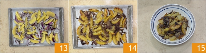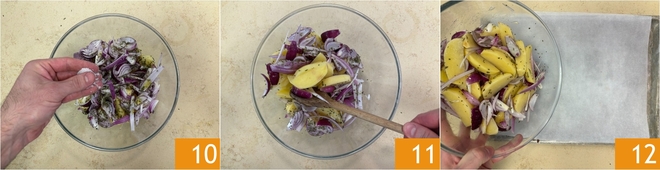 Verdeel ze gelijkmatig, zodat ze elkaar niet overlappen 13. Bak in een voorverwarmde oven (boven- en onderwarmte) op 200°C gedurende ongeveer 40 minuten, halverwege de baktijd voorzichtig omscheppend zonder ze te breken, totdat de aardappels goudbruin en knapperig zijn. Haal je aardappels en uien uit de oven 14 en serveer ze goed heet, en voeg er rauw de resterende 3 eetlepels olie aan toe 15.