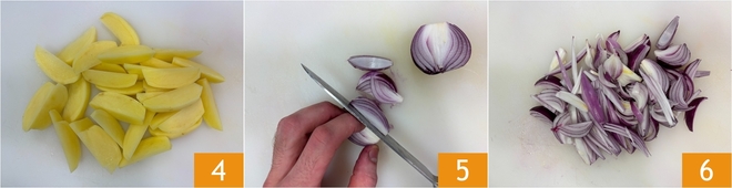 Om de aardappels en uien uit de oven te maken, schil je eerst de aardappels 1 en snijd je ze eerst doormidden 2 en daarna in partjes 3.
