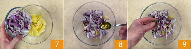 Voeg de uien bij de aardappels 7, voeg 3 eetlepels olie toe 8 en de fijngehakte rozemarijn 9.
