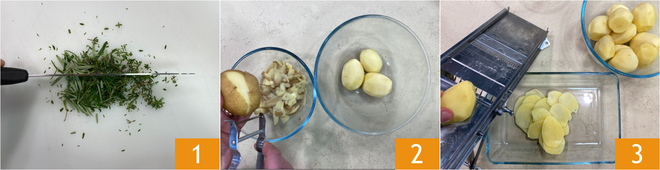Om de aardappelschotel te maken, hak eerst de rozemarijn fijn met een mes 1 en zet opzij. Schil vervolgens de aardappelen 2 en snijd ze met een mandoline in plakken van ongeveer 3 mm dik 3.