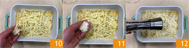 Bedek het oppervlak met de geraspte provolone 10, voeg dan de geraspte kaas toe 11 en een snufje peper 12. Ga zo door tot alle ingrediënten op zijn, je zou uiteindelijk 6 lagen aardappelen moeten hebben.