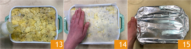 Breng de laatste laag op smaak met olie 13, bedek eerst met een vel bakpapier 14 en vervolgens met een vel aluminiumfolie 15. Bak in een statische oven op 220°C gedurende 70 minuten.