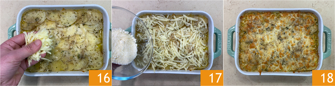 Controleer na deze tijd of de aardappelen gaar zijn en voeg dan de provolone 16 en Parmezaanse kaas 17 toe aan het oppervlak van de schotel. Bak af op dezelfde temperatuur in de grillstand gedurende 5-8 minuten. De aardappelschotel is klaar om te serveren 18.