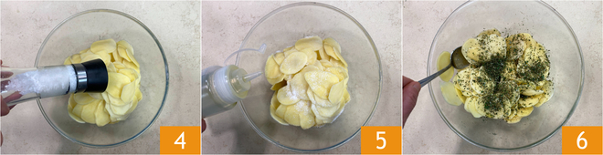 Breng ze vervolgens op smaak met zout 4, peper, olie 5 en de fijngehakte rozemarijn. Meng goed 6 zodat de kruiden zich gelijkmatig over alle schijfjes verdelen 6.