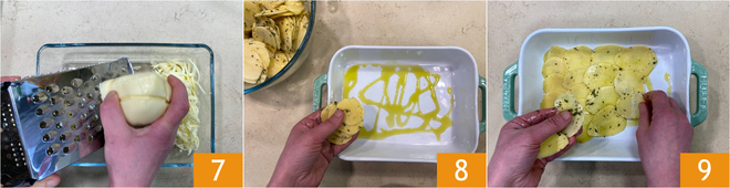 Rasp de provolone met een grove rasp 7 en zet opzij. Giet een scheutje olie op de bodem van een ovenschaal van 25x10,5 cm en leg de aardappelschijfjes erin zodat je een eerste laag vormt 8 9.