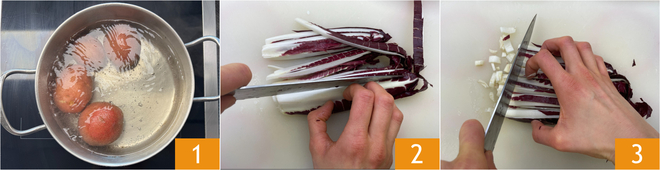 Om de aardappeltaartjes met spinazie en radicchio te maken, kook je eerst de aardappelen in koud gezouten water gedurende ongeveer 30-40 minuten of totdat ze zacht zijn 1. Maak ondertussen de vulling: maak de radicchio schoon en snijd hem eerst in reepjes 2 en daarna in blokjes 3.