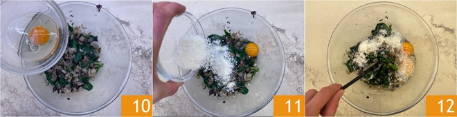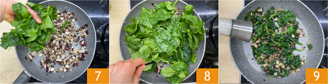 Voeg ook de spinazie toe 7 en bak op middelhoog vuur ongeveer tien minuten. Wanneer de spinazie geslonken is en de radicchio zacht is, zout 8 en peper. Doe alles in een kom en laat iets afkoelen, voeg dan de eieren toe 9.