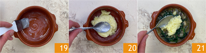 Ga verder met het opbouwen: vet 4 terrines in met boter 19 en verdeel het aardappelmengsel over de bodem en zijkanten 20. Schep de vulling erin en dek af met meer aardappelmengsel, sluit de randen goed af 21.