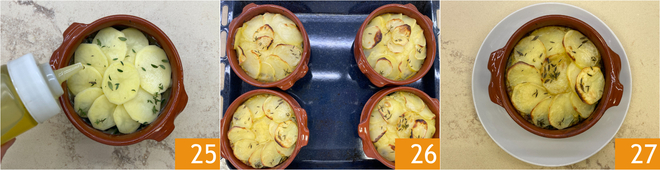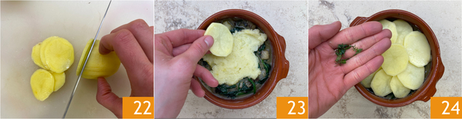 Pel nu de aardappelen voor de bovenkant en snijd ze in plakjes van 2 mm dik 22. Leg de aardappelplakjes bovenop de taartjes 23, bestrooi met zout en garneer met blaadjes tijm 24.