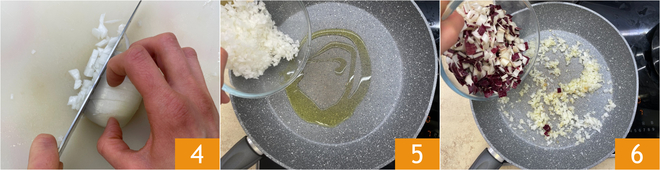 Maak de ui schoon en hak hem fijn 4. Doe de ui in een ruime pan met een scheutje hete olie 5 en fruit een paar minuten. Zodra de ui glazig is, voeg je de radicchio toe 6.