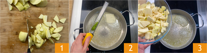 Om de bladerdeegvierkantjes met appel te maken, maak je eerst de appels schoon. Verwijder het klokhuis en snijd ze in vrij dunne plakjes 1. Smelt in een pan de boter en voeg dan de limoenrasp 2 en de appels 3 toe.