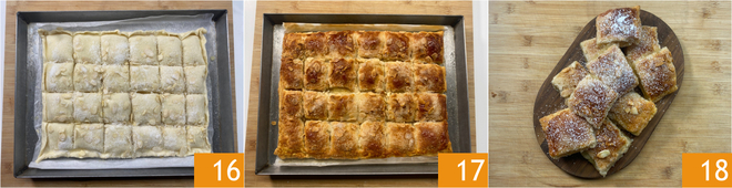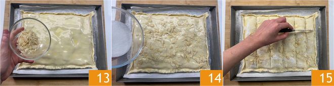 Bestrooi het oppervlak eerst met amandelschaafsel 13 en daarna met suiker 14. Maak met een mes, door zoveel druk te zetten dat je het bovenste bladerdeeg en de vulling insnijdt maar niet het onderste vel, strepen over het bovenblad: 4 aan de korte kant en 6 aan de lange kant 15. Zo maak je de vierkantjes.