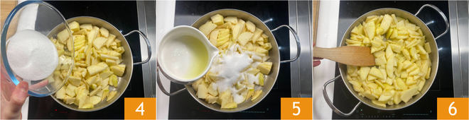 Voeg de suiker toe 4, het limoensap 5 en meng 6. Laat 10 minuten zachtjes koken op middellaag vuur, regelmatig roerend. Er zal een siroop ontstaan die steeds dikker wordt en karamelliseert, terwijl de appels uit elkaar vallen en de structuur van een compote krijgen. Als het klaar is, laat volledig afkoelen.