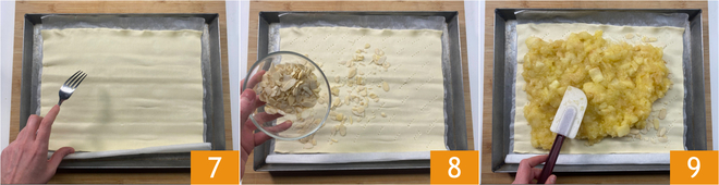 Leg het bladerdeeg op een met bakpapier beklede bakplaat en prik het in met de tanden van een vork 7. Verdeel de amandelschaafsel over het oppervlak 8 die de vulling verrijken en de bladerdeeg gedeeltelijk beschermen tegen het vocht van de vulling. Giet de appelcompote erop 9 en verdeel tot op 2 cm van de randen.