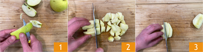 Om de appelcake in de airfryer te bereiden, schil je eerst de appels 1, snijd vervolgens de helft in blokjes van 1,5 cm 2 en de andere helft in plakjes van ongeveer 1 cm dik 3.