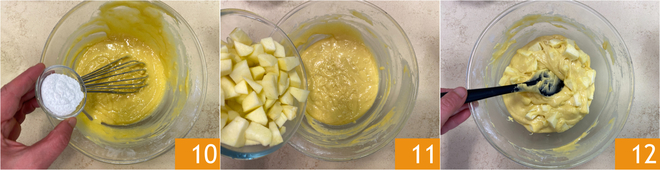 Voeg ook het gezeefde bakpoeder toe 10. Voeg als laatste de appelblokjes toe 11 en meng zorgvuldig met een spatel 12.