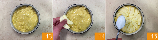 Giet het beslag in een ingevette en met bakpapier beklede bakvorm van 20 cm en strijk het glad 13. Leg de appelplakjes erop 14 en bestrooi met suiker 15.