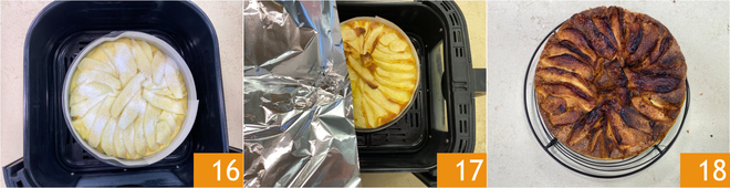 Plaats de vorm in het mandje van de airfryer (wij gebruikten een airfryer met een inhoud van 6,5 liter) 16 en bak op 1550 gedurende 40 minuten, dek hem na de eerste 10 minuten af met een vel aluminiumfolie 17. Na 40 minuten verlaag je de temperatuur naar 1500 en bak je nog 10 minuten. Zet daarna de temperatuur op 1400 en bak nog eens 20 minuten. Verlaag ten slotte de temperatuur naar 1350 en laat nog 15 minuten bakken. We raden altijd aan om de satéprikker-test te doen voor de zekerheid. Zodra hij gaar is, laat je je appelcake uit de airfryer afkoelen 18 voordat je hem bestuift met poedersuiker!