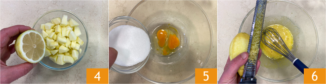 Doe de appelblokjes en -plakjes in aparte kommen, pers het citroensap en zet apart 4. Laat de boter smelten en laat deze iets afkoelen. Doe in een ruime kom de eieren, de suiker 5 en de geraspte citroenschil 6.