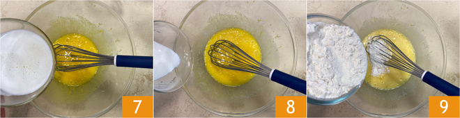 Voeg eerst de lauwwarme gesmolten boter toe 7, daarna de melk 8 en roer goed met een garde zodat het mengsel gelijkmatig wordt. Voeg de gezeefde bloem toe 9.