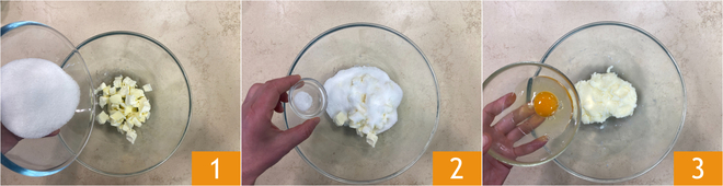 Om de appeltaart met karamel te bereiden, doe je in een kom de boter, de suiker 1 en het zout 2, kneed je met de hand en voeg je daarna het ei toe 3.