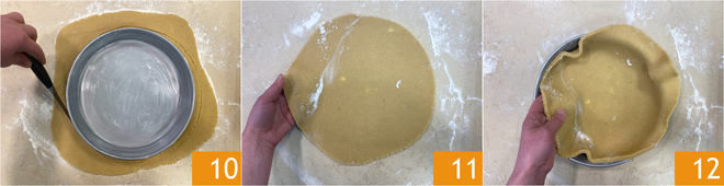 Leg een bakvorm van 22 cm op het deeg en snijd een schijf 10 die iets groter is dan de vorm, zodat bodem en rand bedekt zijn 11. Plaats het zanddeeg in de ingevette vorm 12 en druk het goed aan 12.