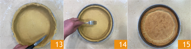 Snijd de rand met een mes bij om hem te verlagen 13, prik de bodem in 14, en bak in een voorverwarmde oven op 180 b0 gedurende 15 minuten. Haal zodra hij gaar is uit de oven en laat afkoelen 15.