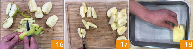 Bereid de appels voor: schil ze 16 en snijd ze in partjes 17, leg ze op een ovenschaal bekleed met bakpapier 18.