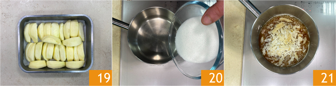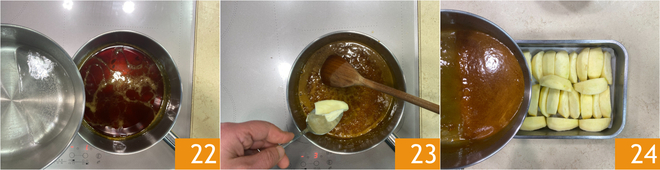 Als de karamel klaar is, giet je het kokende water in twee keer erbij 22, roer je om te laten samensmelten, zet dan het vuur uit en voeg de boter toe 23. Giet de karamel over de appels 24.