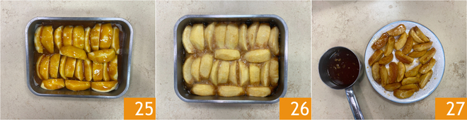 Zet de schaal in een voorverwarmde oven op 180 b0 gedurende 30-40 minuten 25. Haal uit de oven 26 en scheid de karamel van de appels 27.