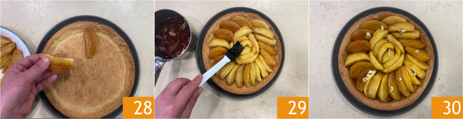 Verdeel nu de appels in waaiervorm over het zanddeeg 28. Verwarm vervolgens de karamel en bestrijk de appels ermee 29. De appeltaart met karamel is klaar; je kunt hem naar smaak verfraaien met bladgoud 30.