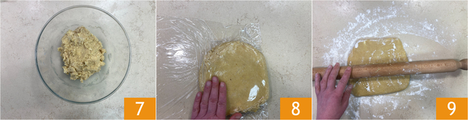 Kneed tot je een homogeen en glad mengsel hebt 7, vorm een rol, wikkel hem in huishoudfolie en leg hem 1 uur in de koelkast 8. Rol het zanddeeg met de deegroller uit 9 tot een dikte van 3 mm.