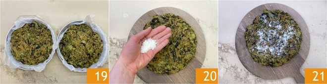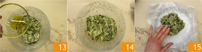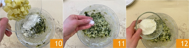 Voeg ook de aardappelen toe 10, meng zonder ze te veel te pletten, breng op smaak met een snufje zout 11 en de geraspte pecorino 12.