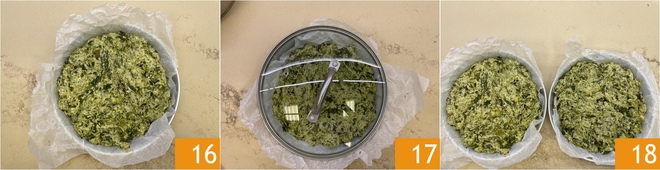 Spreid het uit met behulp van een scheutje olie 16. Dek af met een deksel 17 en laat op kamertemperatuur rijzen gedurende ongeveer 1 uur en 30 minuten, indien nodig tot 2 uur. Nadat deze tijd verstreken is, haal je de gerezen pizza's tevoorschijn 18.