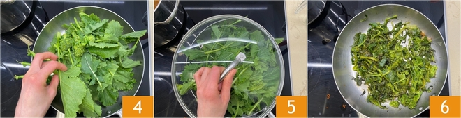 Voeg de friarielli toe 4, dek af met een deksel 5 en laat ongeveer 10 minuten op matig vuur koken totdat ze geslonken zijn 6.