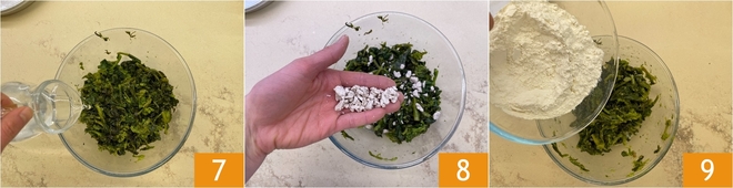 Schep de friarielli in een kom, voeg dan het water toe 7, de verkruimelde gist 8, roer om de gist op te lossen, en voeg vervolgens de bloem toe 9.