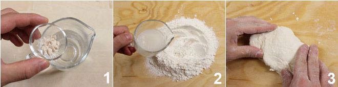 Om de baguette met zuurdesem te maken begin je de dag ervoor met het bereiden van de biga: los 5 g biergist op in het water 1 en maak van de bloem een kuiltje, giet vervolgens beetje bij beetje het water met gist in het midden 2 en kneed met de handen tot een glad deeg 3.