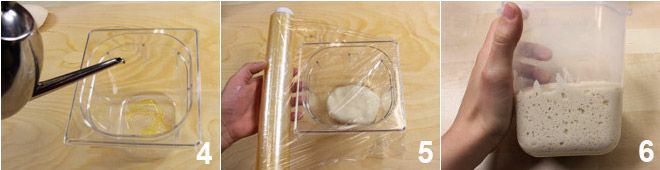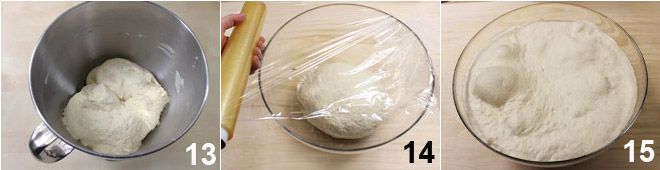 Blijf kneden en voeg ook het water met het zout toe: het resultaat moet een glad, soepel en homogeen deeg zijn 13. Dek het deeg af met plasticfolie 14 en laat het een paar uur rijzen in de oven met het licht aan totdat het in volume verdubbeld is 15.