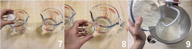 De volgende dag kun je doorgaan met de eigenlijke bereiding van de baguette: los het zout op in 200 g lauwwarm water en los de 2 g biergist op in de overige 200 g water (7-8). Meng de type 0- en type 00-bloem samen in een kom 9 (voor het kneden kun je een keukenmachine met deeghaak of gewoon je handen gebruiken).