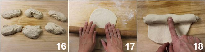 Verdeel het deeg in 6 stukken van elk 200 g 16, rol ze vervolgens één voor één uit met een deegroller 17 en rol ze op vanaf de korte zijde, druk zachtjes naar het midden toe 18.