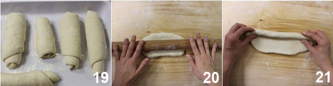 Laat de gevormde cilinders op een met bloem bestoven dienblad rusten gedurende 45 minuten tot 1 uur, met de naad naar beneden 19. Na deze tijd rol je de cilinders opnieuw uit met de deegroller 20 en rol je ze nu op vanaf de lange zijde 21.