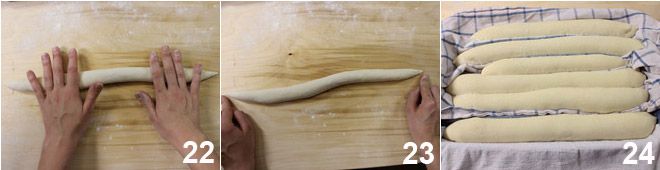 Druk ze met beide handen aan 22 en rek de baguette uit tot ongeveer 35 cm, maak de uiteinden weer puntig 23. Leg de baguettes op een met bloem bestoven doek, goed uit elkaar geplaatst tussen de plooien van het doek en laat nog een uur rijzen 24. Nadat een halfuur is verstreken, verwarm je de oven tot 250