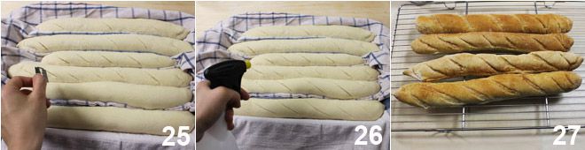 Voordat je ze in de oven schuift, maak met een scheermesje stevige schuine insneden over de lengte van de baguettes 25 en besprenkel ze met water uit een plantenspuit 26. Haal de hete bakplaat eruit en schuif de baguettes erop door ze rechtstreeks van het doek te laten glijden (raak ze zo min mogelijk aan om de rijs niet te laten zakken). Zet de oven naar 240