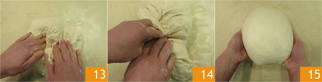Bestuif het werkvlak licht met wat meel voor pinsa. Kieper het deeg op het werkvlak en vouw het als volgt: pak telkens de rand van het deeg en trek die naar het midden 13. Je zult zien dat het deeg geleidelijk gladder wordt 14. Keer het vervolgens om en vorm een bol door het over het werkvlak te rollen om de sluiting goed te dichten 15.