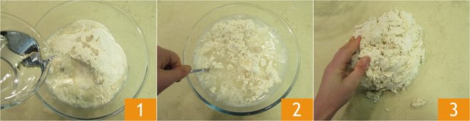 Om het basisdeeg voor pinsa te bereiden, doe je eerst het meel voor pinsa en de verkruimelde verse bakkersgist in een ruime kom. Voeg ook 700 g koud water uit de koelkast toe 1 en roer met een lepel 2 totdat het opgenomen is. Verplaats het deeg op een werkvlak en begin te kneden zonder extra meel toe te voegen 3. Maak je geen zorgen als het mengsel aanvankelijk heel grof lijkt.