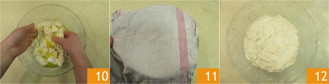 Blijf nog enkele minuten met je handen kneden 10, zodat alle ingrediënten goed opgenomen worden. Je kunt ook op het werkvlak kneden en een paar bindvouwen geven als je dat prettig vindt. Het deeg zal al gladder zijn. Om het nog gladder te maken kun je het 15 minuten afgedekt met een theedoek in de kom laten rusten 11. Na die tijd haal je de kom weer tevoorschijn 12.