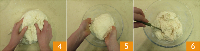 Kneed lang door tot je een gladde en compacte consistentie hebt 4. Doe het deeg terug in een kom 5 en maak 3 inkervingen met een mes 6: deze handeling helpt dat de later toegevoegde ingrediënten beter opgenomen worden.