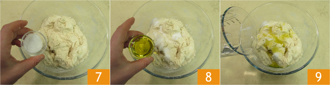 Voeg vervolgens het zout 7, de olie 8 en de resterende 50 g koud water toe; voeg dat laatste beetje bij beetje toe 9 terwijl je blijft kneden.