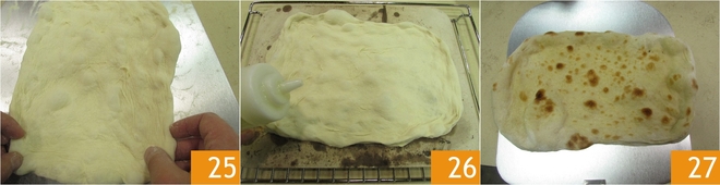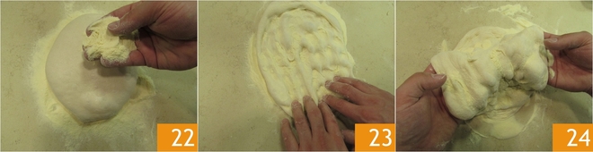Na de rijs van de bolletjes pak je er één en leg je die op een werkvlak dat royaal bestrooid is met semolina. Bestuif ook de bovenkant met semolina 22. Begin bij de rand die het dichtst bij je is en druk lichtjes met je vingers om het deeg plat te drukken. Je moet je vingers bijna parallel aan het werkvlak houden zodat de lucht gelijkmatig wordt verdeeld 23. Geef het zo veel mogelijk een rechthoekige, ovale vorm. Terwijl je het deeg voorzichtig optilt, verwijder je overtollige semolina 24.
