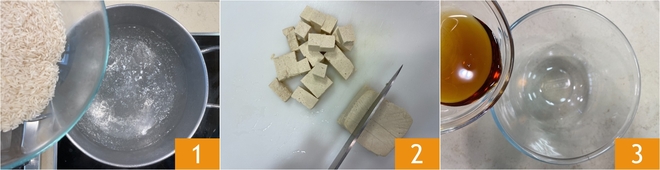Om basmatirijst met tofu in sojasaus en gewokte groenten te bereiden, doe je eerst de rijst in ruim gezouten water 1 en kook je volgens de tijd die op de verpakking staat. Bereid ondertussen de andere ingrediënten: snijd de tofu in blokjes en giet vervolgens in een kom de ahornsiroop 3.